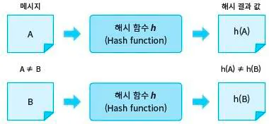 서로 다른 입력 메시지에 대해서는 서로 다른 해시 결과값이 계산