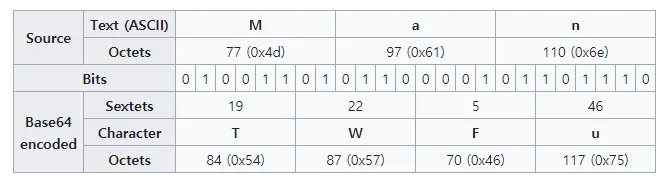 원본 문자열 ⇒ ASCII binary ⇒ 6비트로 자름 ⇒ base64 encoding