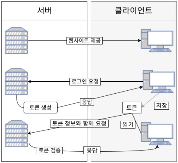 토큰 기반 인증 시스템은 클라이언트가 서버에 접속을 하면 서버에서 해당 클라이언트에게 인증되었다는 의미로 토큰을 부여한다.