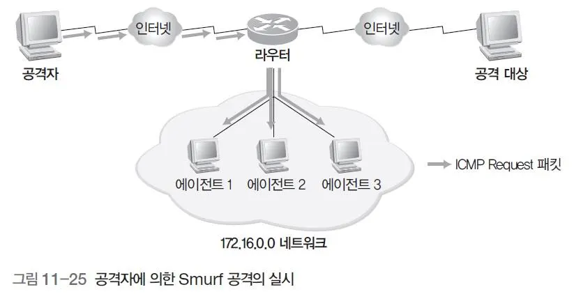 네트워크 주소가 172.16.0.0 일 때, 공격자가 피공격자 IP 주소를 위조하여 목적지 방송 주소 172.16.0.255로 다이렉트 브로드 캐스트 형식으로 보냄