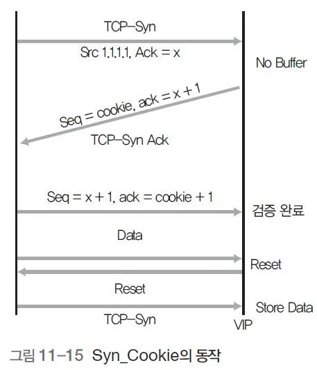 클라이언트로부터 SYN 패킷을 받으면 서버는 간단한 인증 정보가 담긴 SYN_cookie를 시퀀스 값에 넣고 전송 후 세션 종료