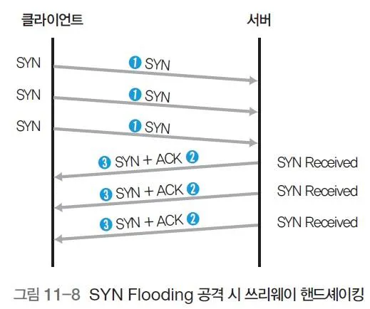 공격자는 많은 숫자의 SYN 패킷을 서버에 보냄