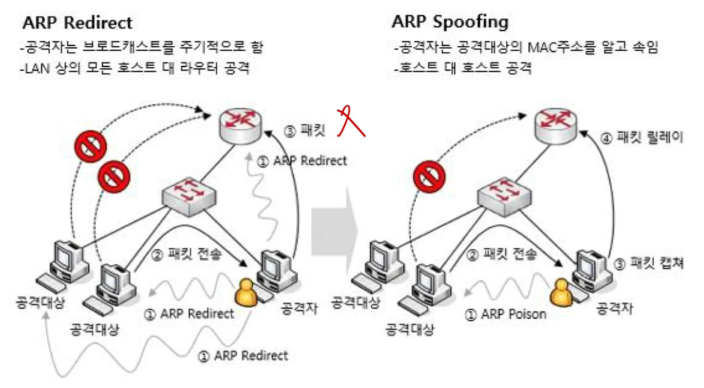 ARP 리다이렉트 공격과 유사하지만, 공격자가 공격대상의 ARP 테이블을 변경시켜 공격자를 통해 패킷을 보내도록 유도